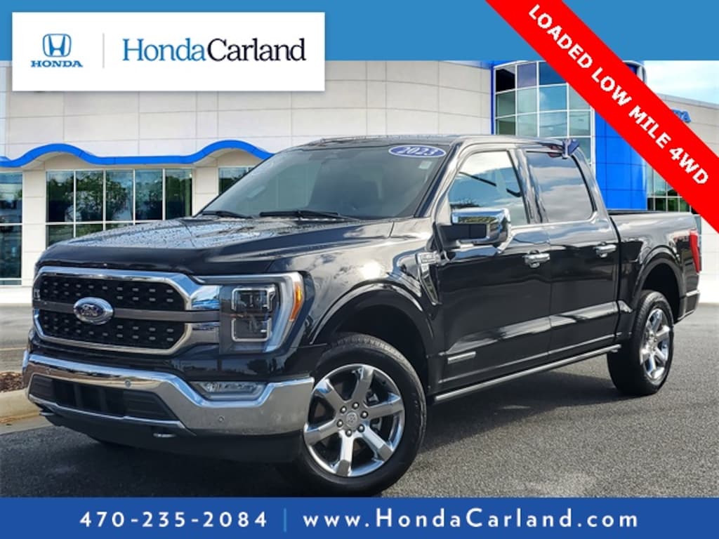 2023 FORD KING RANCH 4X4!! Receive a LIFETIME Limited Powertrain Warranty - FREE OF CHARGE!! CARFAX One-Owner. Clean CARFAX. Agate Black Metallic 2023 Ford F-150 King Ranch 4WD 10-Speed Automatic LIFETIME POWERTRAIN WARRANTY, REMAINDER OF FACTORY WARRANTY, BLUETOOTH MP3, BACKUP CAMERA, BLINDSPOT, NAVIGATION NAV GPS, SUNROOF MOONROOF, SIRIUS XM SATELLITE RADIO, REMOTE KEYLESS ENTRY, REMOTE START, HEATED SEATS, COOLED SEATS, CLEAN CARFAX HISTORY, ONE OWNER, LOW MILEAGE, 3.5L PowerBoost Full-Hybrid V6, 4WD, 360 Degree Camera, 4x4 FX4 Off-Road Bodyside Decal, 8 Speakers, Adjustable pedals, Alloy wheels, AM/FM radio: SiriusXM with 360L, Auto High-beam Headlights, Auto tilt-away steering wheel, Auto-dimming Rear-View mirror, Automatic temperature control, Bed Utility Package, BoxLink, Brake assist, Bright Belt Moldings, Chrome Door Handles w/Body-Color Strap, Chrome Skull Caps on Exterior Mirrors, Class IV Trailer Hitch Receiver, Delay-off headlights, Dual front impact airbags, Dual front side impact airbags, Electronic Locking w/3.31 Axle Ratio, Electronic Stability Control, Equipment Group 601A High, Exterior Parking Camera Rear, Front dual zone A/C, Front fog lights, Fully automatic headlights, FX4 Off-Road Package, Garage door transmitter, Heated front seats, Heated rear seats, Heated steering wheel, Hill Descent Control, Integrated Trailer Brake Controller, King Ranch Chrome Appearance Package, King Ranch Leather Bucket Seats, King Ranch Monochromatic Paint Package, LED Box Lighting, Memory seat, Monotube Rear Shocks, Multi-Contour Driver & Passenger Seats, Multicontour Seats w/Active Motion Removal, Navigation system: Connected Navigation, Off-Road Tuned Front Shock Absorbers, Outside temperature display, Overhead airbag, Painted Body-Color Wheellip Molding, Panic alarm, Pedal memory, Power driver seat, Power Tailgate, Power-Deployable Running Boards, Pro Trailer Backup Assist & Pro Trailer Hitch Assist, Radio data system, Radio: B&O Sound System by Bang & Olufsen, Radio: B&O Unleashed Sound System by Bang & Olufsen, Rain sensing wipers, Remote keyless entry, Rock Crawl Mode, Security system, Speed control, Steering wheel memory, Steering wheel mounted audio controls, SYNC 4 w/Enhanced Voice Recognition, Tailgate Step w/Tailgate Work Surface, Trailer Tow Package, Tray Style Floor Liner, Twin Panel Moonroof, Ventilated front seats, Wheels: 20" Chrome-Like PVD.