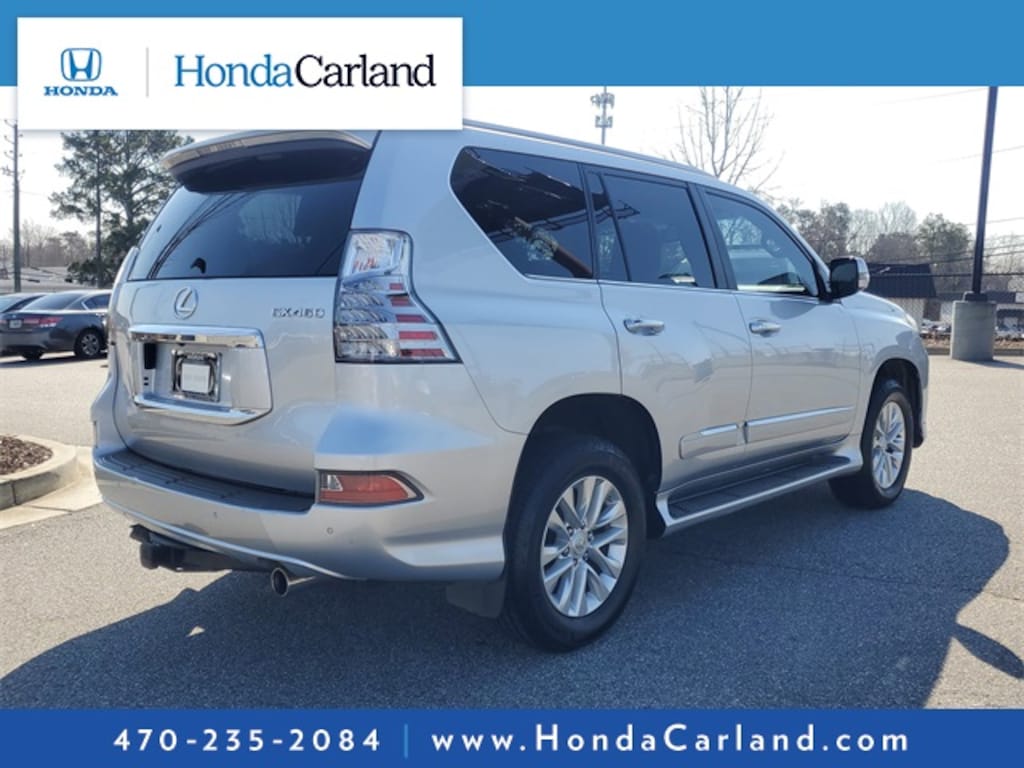 Clean CARFAX. Silver Lining Metallic 2015 Lexus GX 460 4WD 6-Speed Automatic with Sequential Shift ECT BLUETOOTH MP3, BACKUP CAMERA, BLINDSPOT, NAVIGATION NAV GPS, SUNROOF MOONROOF, SIRIUS XM SATELLITE RADIO, CD PLAYER, REMOTE KEYLESS ENTRY, REMOTE START, HEATED SEATS, COOLED SEATS, CLEAN CARFAX HISTORY, 3rd row seats: split-bench, 9 Speakers, ABS brakes, Alloy wheels, AM/FM radio: SiriusXM, Auto tilt-away steering wheel, Auto-dimming Rear-View mirror, Automatic temperature control, Brake assist, CD player, Compass, Delay-off headlights, Dual front impact airbags, Dual front side impact airbags, Electronic Stability Control, Exterior Parking Camera Rear, Front Bucket Seats, Front dual zone A/C, Fully automatic headlights, Garage door transmitter: HomeLink, Heated door mirrors, Heated front seats, Knee airbag, Memory seat, Navigation Package, Navigation System, NuLuxe Seat Trim, Overhead airbag, Power door mirrors, Power driver seat, Power moonroof, Power passenger seat, Preferred Accessory Package, Radio data system, Radio: AM/FM Lexus Premium Audio, Remote keyless entry, Security system, Speed control, Steering wheel memory, Steering wheel mounted audio controls.