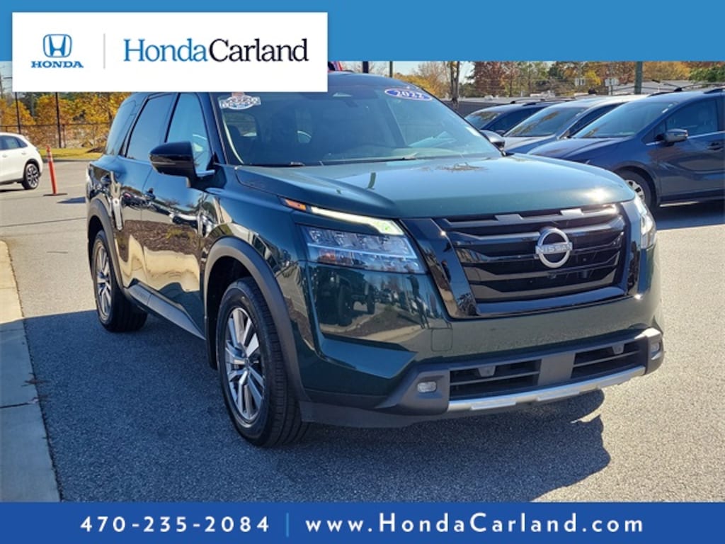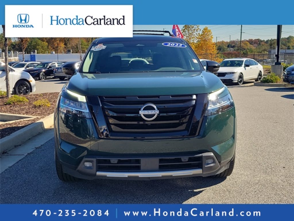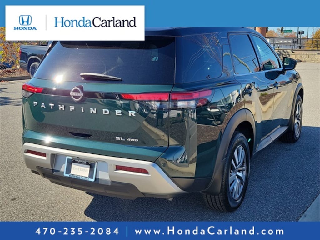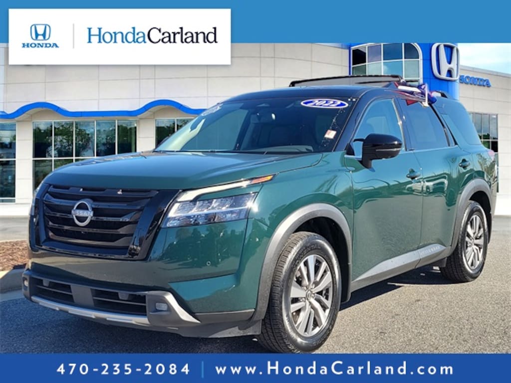 Receive a LIFETIME Limited Powertrain Warranty - FREE OF CHARGE!! CARFAX One-Owner. Clean CARFAX. Obsidian Green Pearl/Super Black 2022 Nissan Pathfinder SL 4WD 4WD 9-Speed Automatic LIFETIME POWERTRAIN WARRANTY, REMAINDER OF FACTORY WARRANTY, BLUETOOTH MP3, BACKUP CAMERA, BLINDSPOT, NAVIGATION NAV GPS, SIRIUS XM SATELLITE RADIO, REMOTE KEYLESS ENTRY, REMOTE START, HEATED SEATS, CLEAN CARFAX HISTORY, ONE OWNER, 4WD, 3rd row seats: bench, 6 Speakers, ABS brakes, Alloy wheels, AM/FM radio: SiriusXM, Auto High-beam Headlights, Auto-dimming Rear-View mirror, Automatic temperature control, Delay-off headlights, Dual front impact airbags, Dual front side impact airbags, Exterior Parking Camera Rear, Front Bucket Seats, Front dual zone A/C, Front fog lights, Fully automatic headlights, Garage door transmitter: HomeLink, Heated door mirrors, Heated Front Bucket Seats, Heated front seats, Heated steering wheel, Knee airbag, Leather Seating Surfaces, Leather steering wheel, Navigation system: NissanConnect Navigation, NissanConnect w/Navigation & Services, Outside temperature display, Overhead airbag, Power door mirrors, Power driver seat, Power Liftgate, Power passenger seat, Radio data system, Radio: AM/FM Audio System, Remote keyless entry, Security system, Speed control, Steering wheel mounted audio controls.